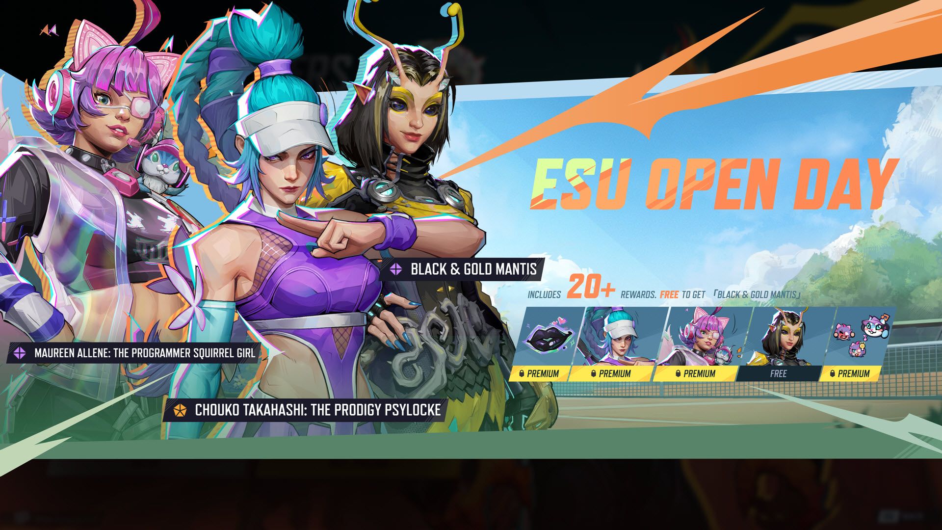 Присоединяйтесь к нам на Дне открытых дверей ESU! Примите участие в увлекательных мероприятиях, чтобы получить эксклюзивный костюм Мантис — Чёрный и Золотой бесплатно! Мы также раздаём другие интересные награды, такие как Squirrel Girl — Maureen Allene: The Programmer, Psylocke — Chouko Takahashi: The Prodigy, и многое другое!